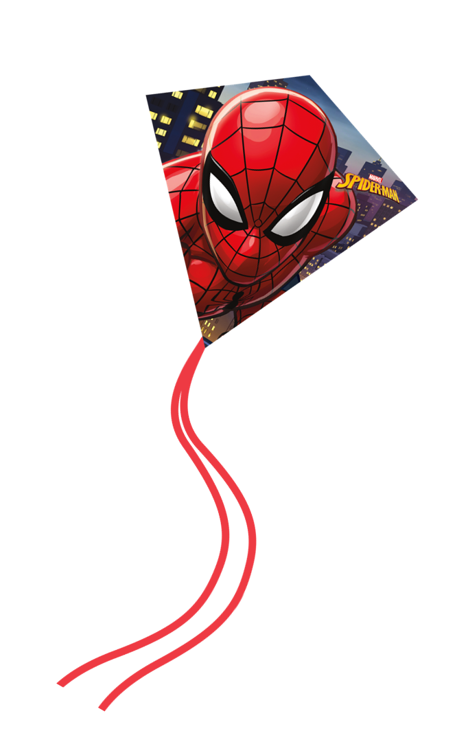 - Spiderman KITE SPECS: 25 Inches Tall Comes with Officially Licensed Spiderman Nylon Diamond Kite Sail, Fiberglass Airframe, SkyTails, Kite Handle, and 100ft of 15lb Kite Line w/ QuikClip