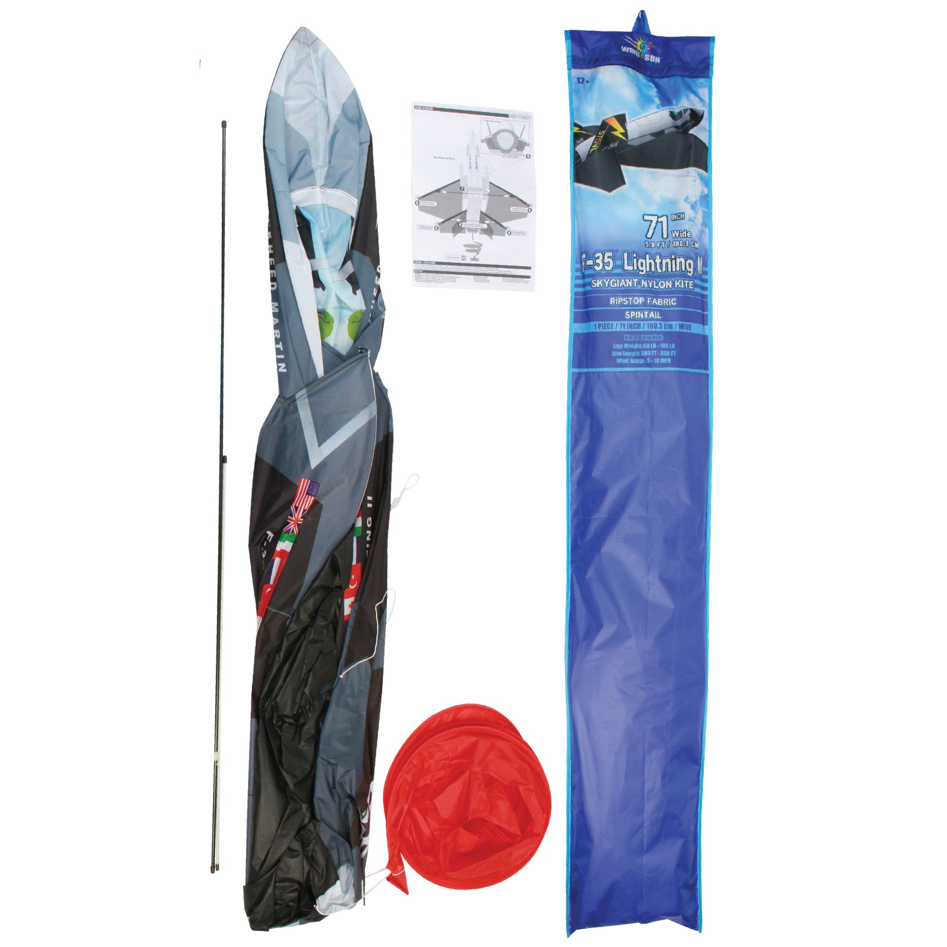 The WindNSun SkyGiant F-35 Lightning II Ripstop Nylon Jet Kites come with F-35 Lightning II SkyGiant Ripstop Nylon Jet Kite Sail, Fiberglass Airframe, SkyTails®, Kite Handle, and 300ft of 60lb Kite Line w/ QuikClip®.